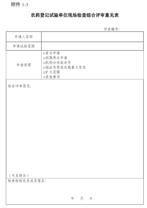1-3农药登记试验单位现场检查综合评审意见表